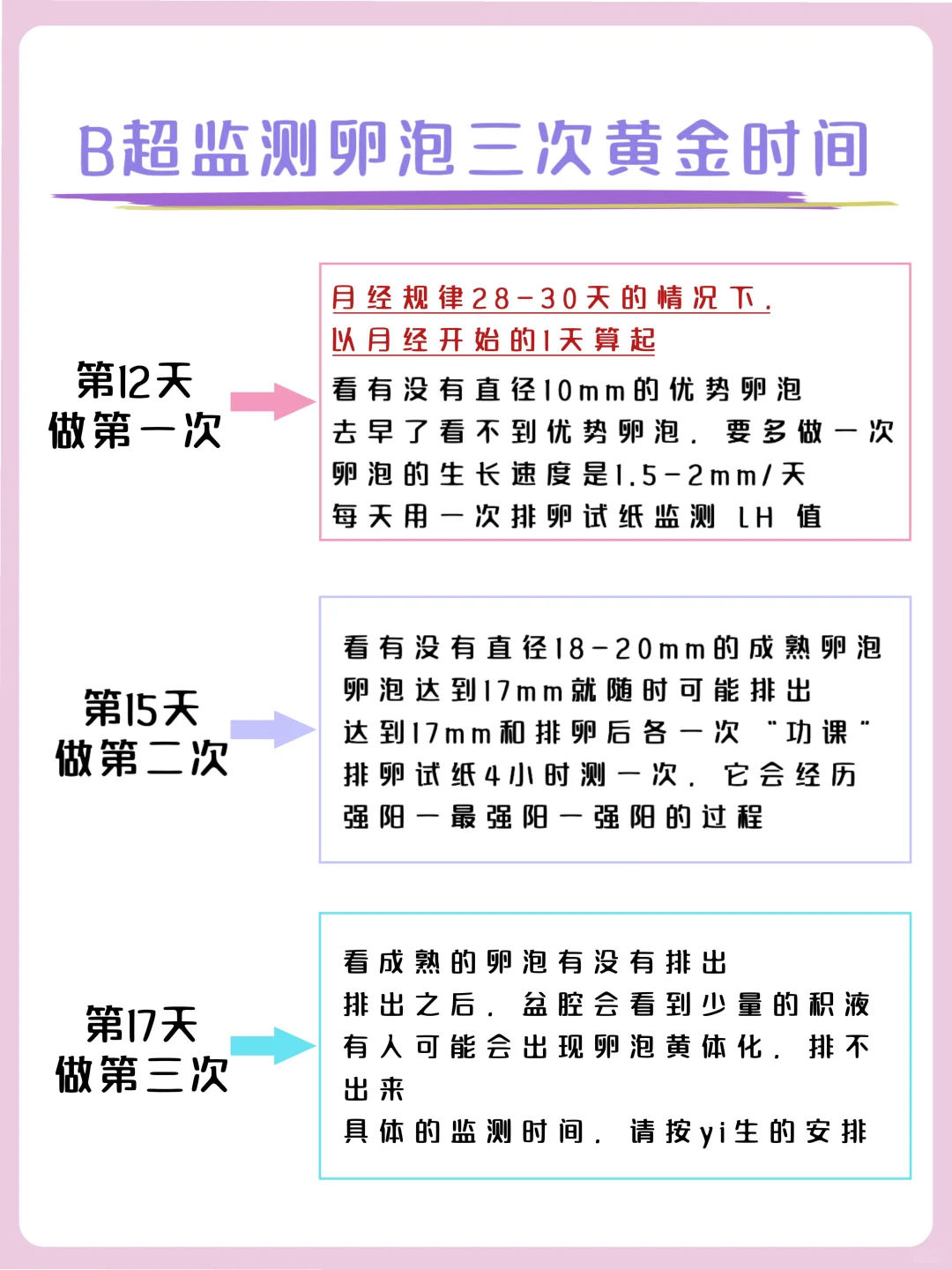 具体的监测时间,医生会根据每个人的末次月经时间和月经周期来安排,每次做完b超,拿报告找医生预约下一次的时间就好。#备孕 #备孕日记 #接好孕 #备孕攻略 #卵子监测 #科学备孕 #排卵期 #排卵期同房 #排卵期备孕 #排卵期怎么算