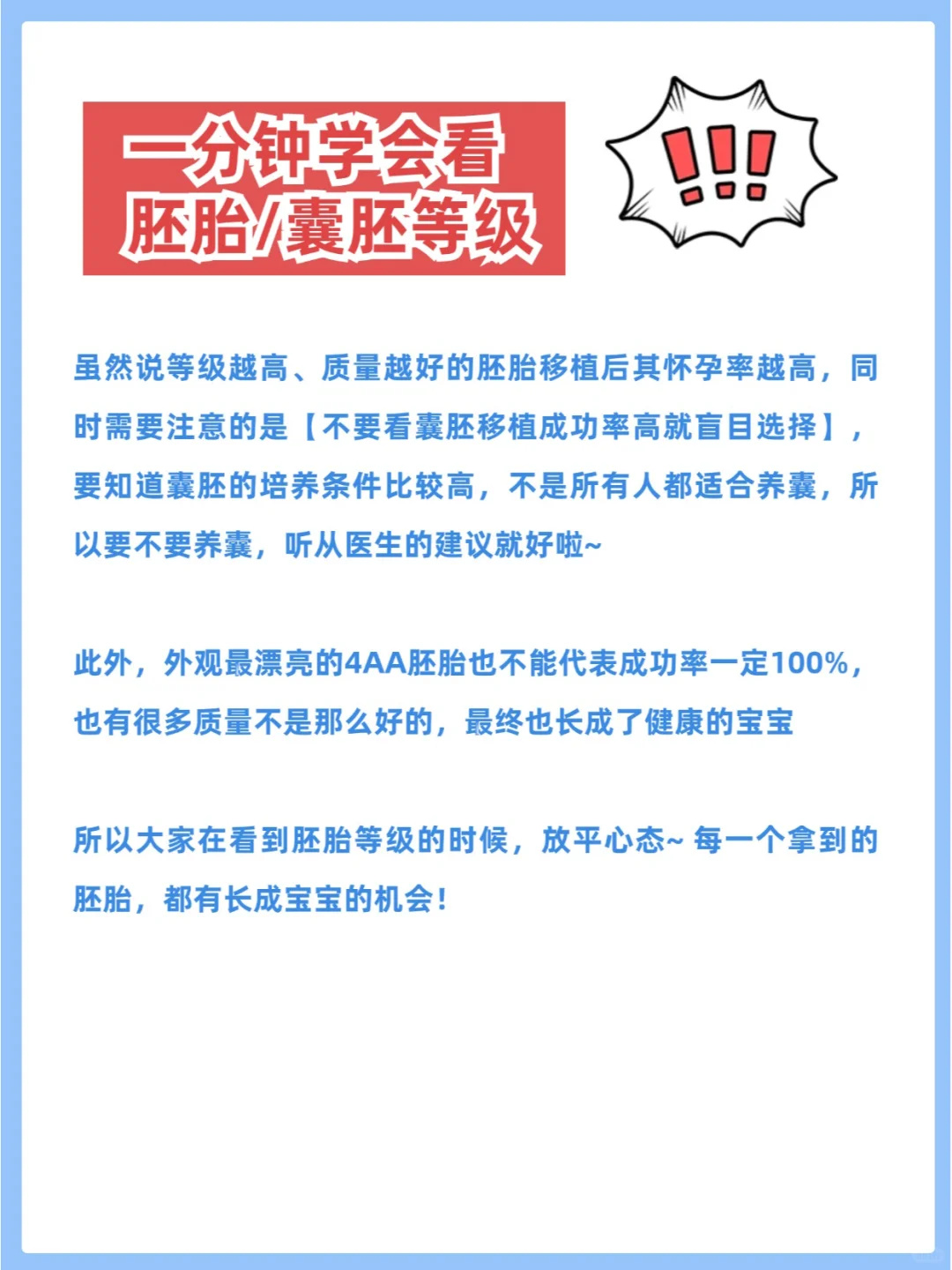 少的囊胚,仅有几个大细胞,移植成g率一般。🔷虽然说等级越高、质量越好的胚胎移植后其怀孕率越高,同时需要注意的是【不要看囊胚移植成功率高就盲目选择】,要知道囊胚的培养条件比较高,不是所有人都适合养囊,所以要不要养囊,听从医生的建议就好啦~
