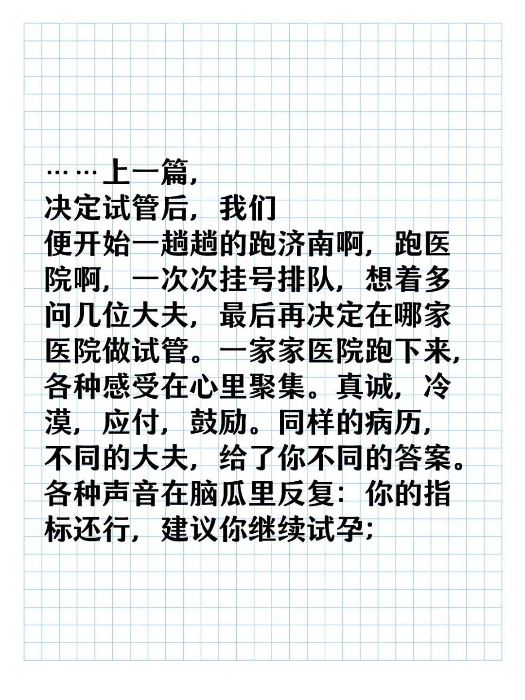 决定试管后,我们便开始一趟趟的跑济南啊,跑医院啊,一次次挂号排队,想着多问几位大夫,最后再决定在哪家医院做试管。一家家医院跑下来,各种感受在心里聚集。真诚,冷漠,应付,鼓励。同样的病历,不同的大夫,给了你不同的答案。各种声音在脑瓜里反复:你的指标还行,建议你继续试孕;你的检查不够,还需要继续做XX检查;你的指标还达不到做试管的标准……2026年的夏天,真是有喜有忧的在奔波忙碌中度过。。。在结束八月初的问诊咨询后。我们决定在山东中医药大学第二附属医院做试管啦。接着,我们在当月,完成了前期的检查,信心满满的等待下